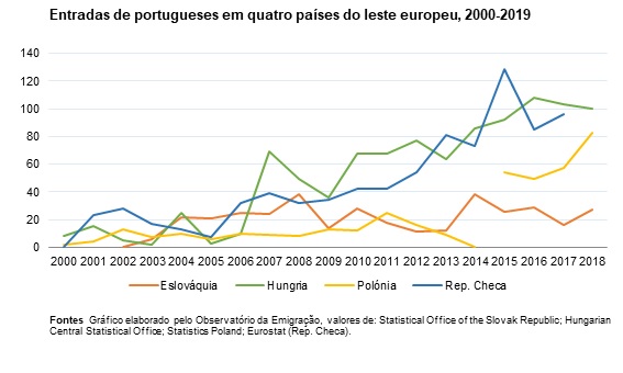 A Eslováquia é, destes quatro países, aquele com menor número de entradas de portugueses entre 2004 e 2019, sempre abaixo das 40 por ano. Ao longo de todo o período, os valores das entradas neste país oscilaram entre um mínimo de 6, em 2004, e um máximo de 38, em 2009 e 2015.