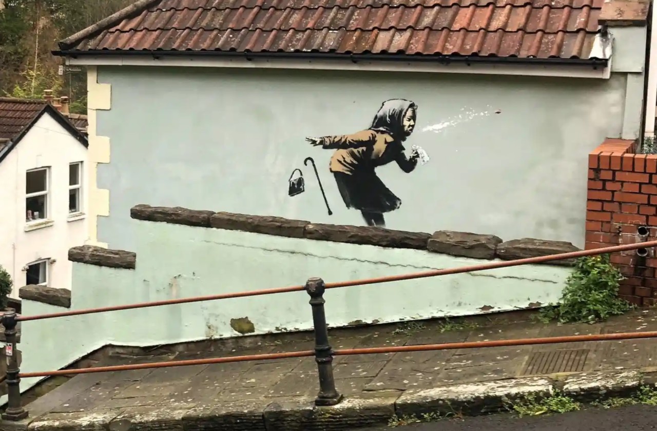 A obra, intitulada “Aachoo!!”, foi descoberta na parede exterior de uma casa em Totterdown, Bristol, na manhã de quinta-feira, e mostra uma idosa a espirrar violentamente, largando a bengala, enquanto a dentadura postiça é projetada no ar.